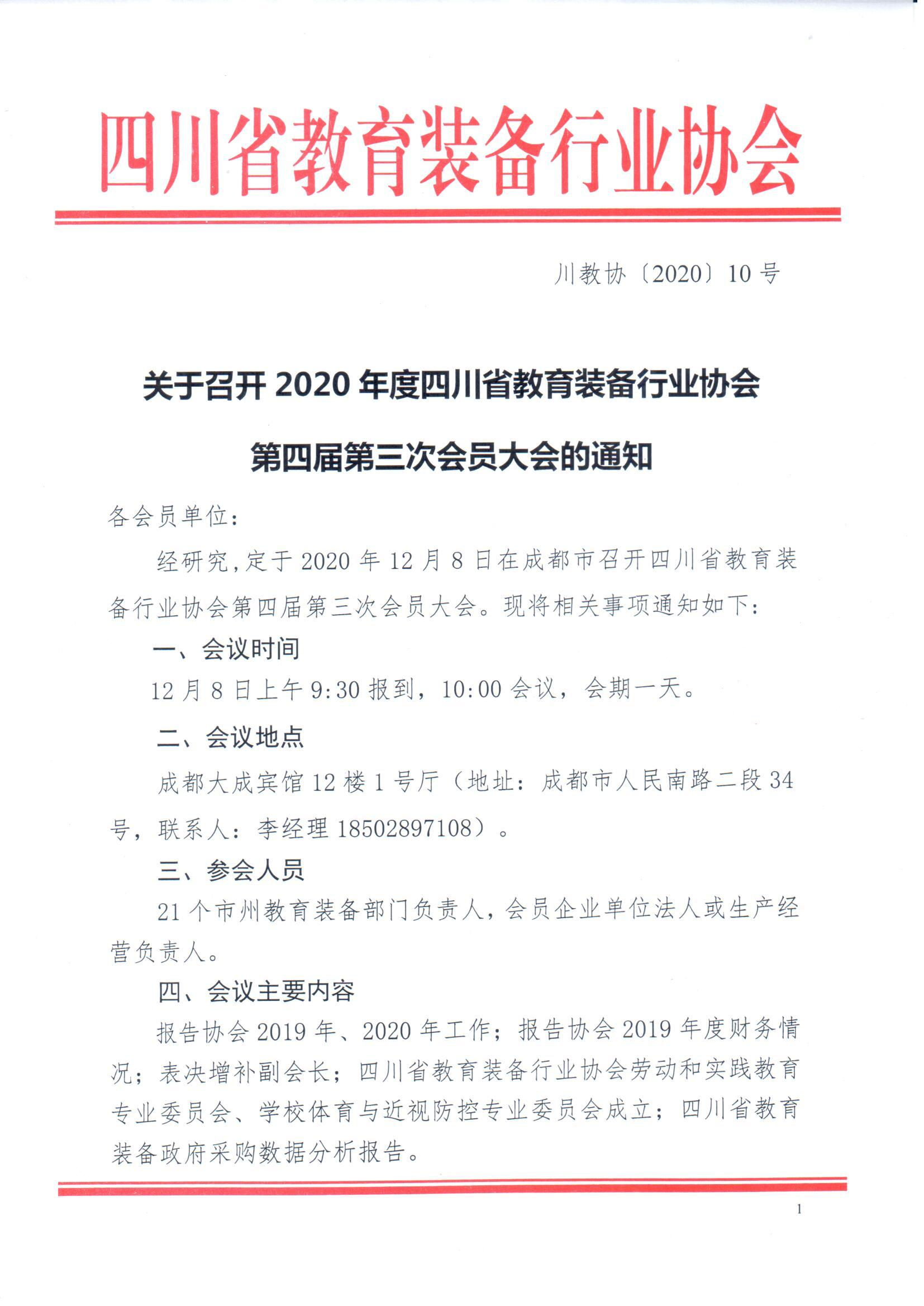 关于召开2020年度四川省教育装备行业协会第四届第三次会员大会的通知